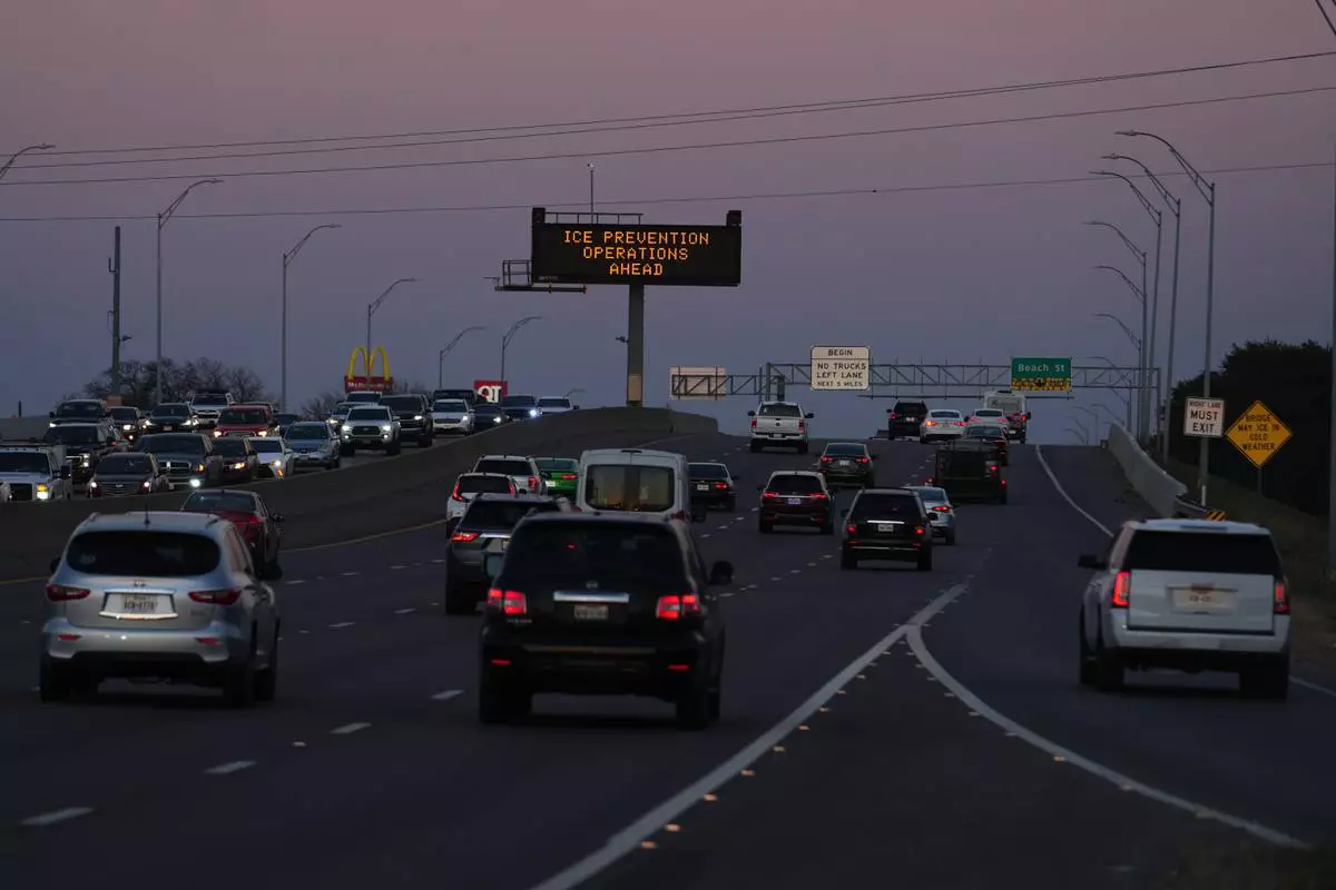 A sign visible from the eastbound lanes of Highway 121 warns of road preparations ahead of inclement weather expected in the region Wednesday, Jan. 21, 2026, in Fort Worth, Texas. (AP Photo/Julio Cortez)