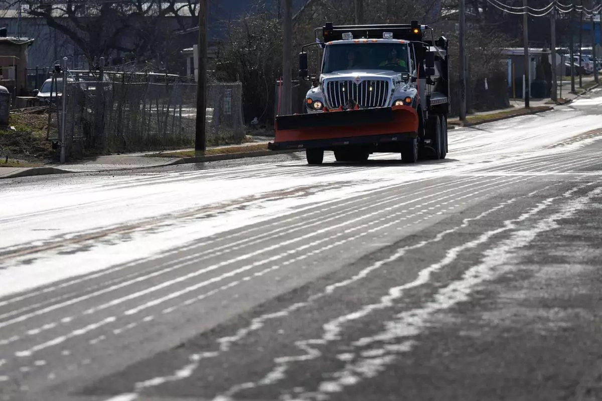 A Nashville Department of Transportation truck applies salt brine to a roadway Thursday, Jan. 22, 2026, in Nashville, Tenn. ahead of a winter storm expected to hit the state over the weekend. (AP Photo/George Walker IV)