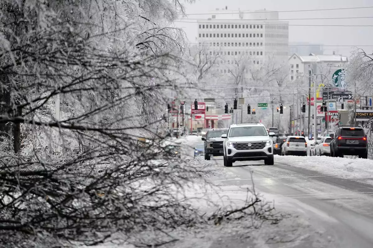 A motorist passes an ice covered tree limb blocking a lane along West End Ave. during a winter storm Sunday, Jan. 25, 2026, in Nashville, Tenn. (AP Photo/George Walker IV)