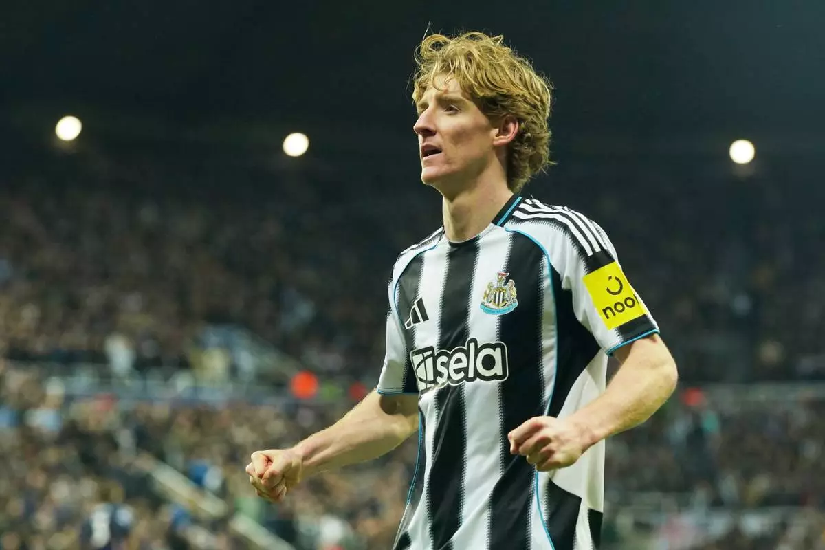 Newcastle's Anthony Gordon celebrates after scoring his side's second goal during the Champions League soccer match between Newcastle and PSV in Newcastle, England, Wednesday, Jan. 21, 2026. (AP Photo/Ian Hodgson)