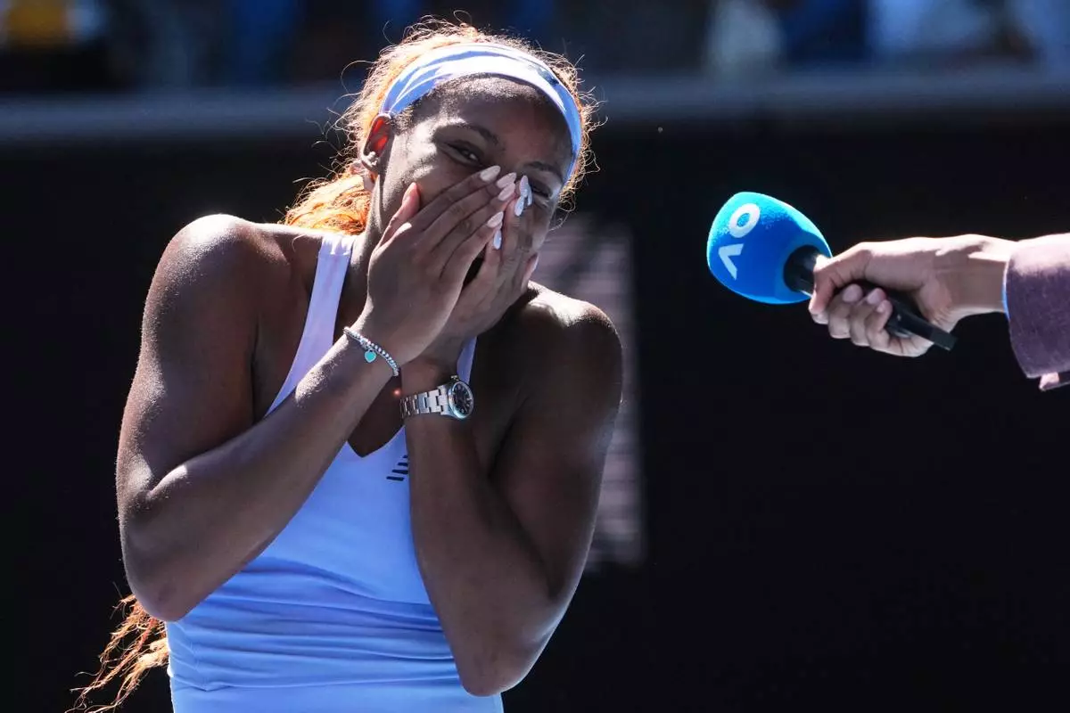 Coco Gauff of the U.S. reacts during an on court interview following her second round match against Olga Danilovic of Serbia at the Australian Open tennis championship in Melbourne, Australia, Wednesday, Jan. 21, 2026. (AP Photo/Asanka Brendon Ratnayake)