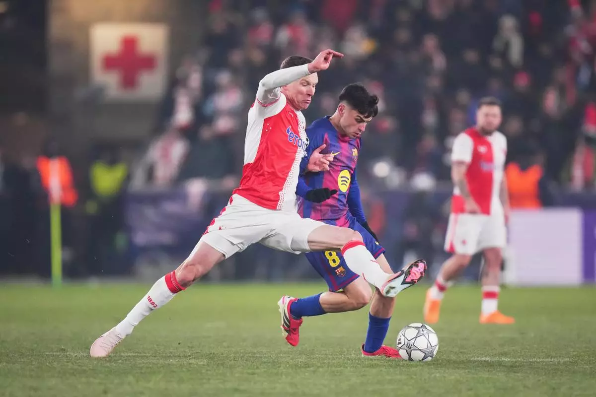 Barcelona's Pedri, right, is challenged by Slavia's Lukas Provod during the Champions League opening phase soccer match between Slavia Prague and Barcelona in Prague, Czech Republic, Wednesday, Jan. 21, 2026. (AP Photo/Petr David Josek)