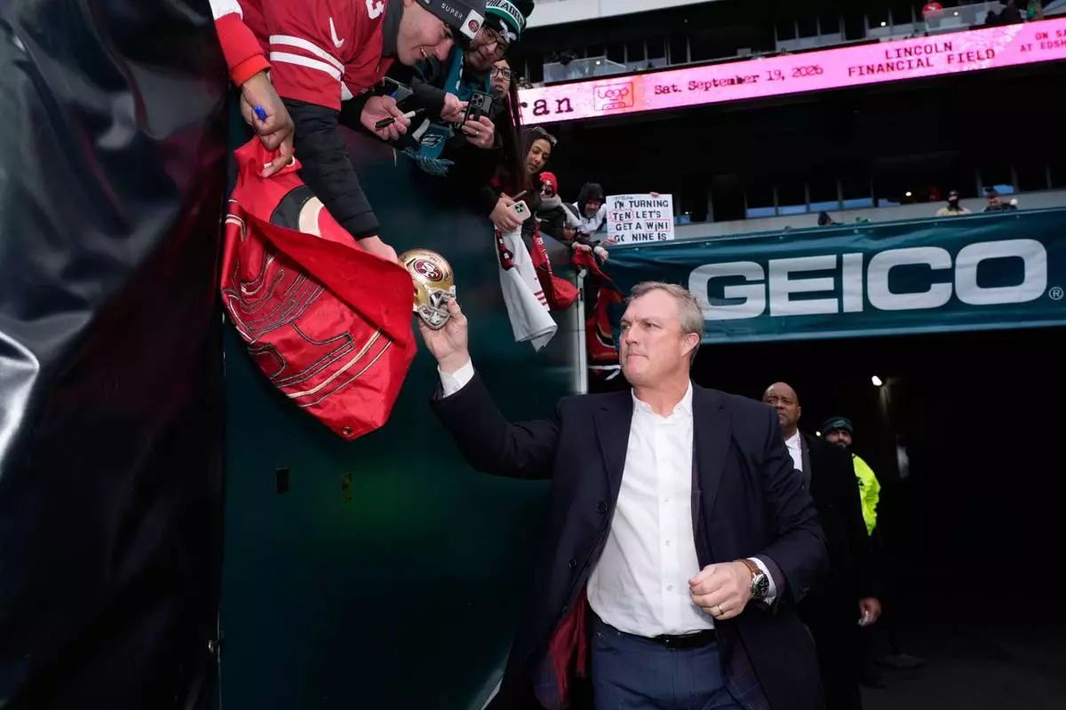 San Francisco 49ers General Manager John Lynch signs autographs before an NFL wild-card playoff football game against the Philadelphia Eagles on Sunday, Jan. 11, 2026, in Philadelphia. (AP Photo/Chris Szagola)