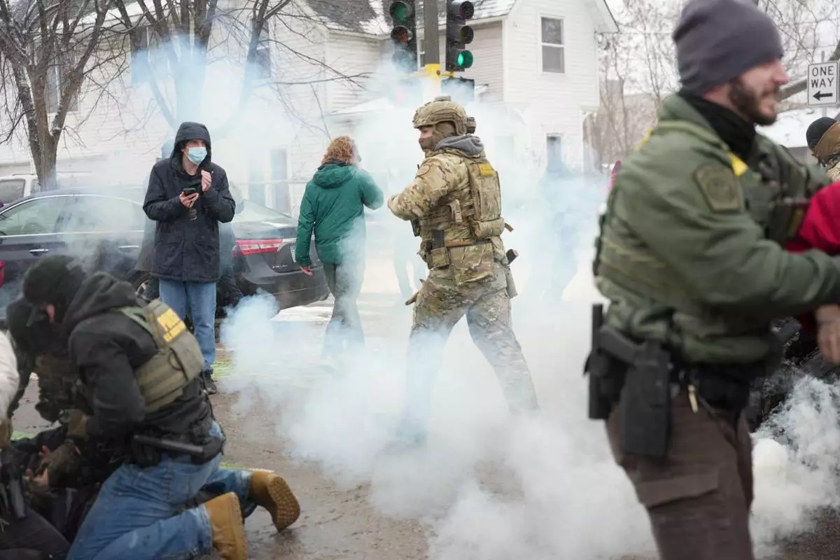 Tear gas is deployed as Federal agents make arrests on Wednesday, Jan. 21, 2026, in Minneapolis. (AP Photo/Angelina Katsanis)