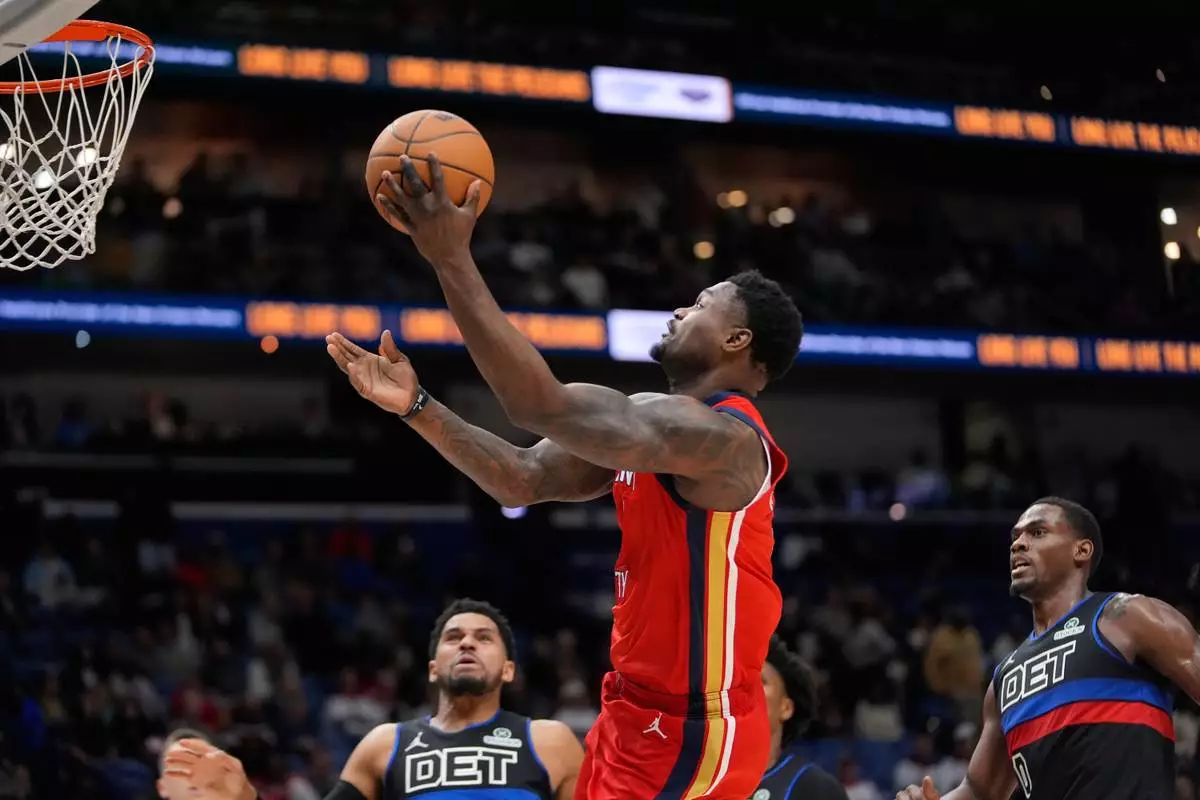 New Orleans Pelicans forward Zion Williamson goes to the basket against the Detroit Pistons in the first half of an NBA basketball game, Wednesday, Jan. 21, 2026, in New Orleans. (AP Photo/Gerald Herbert)