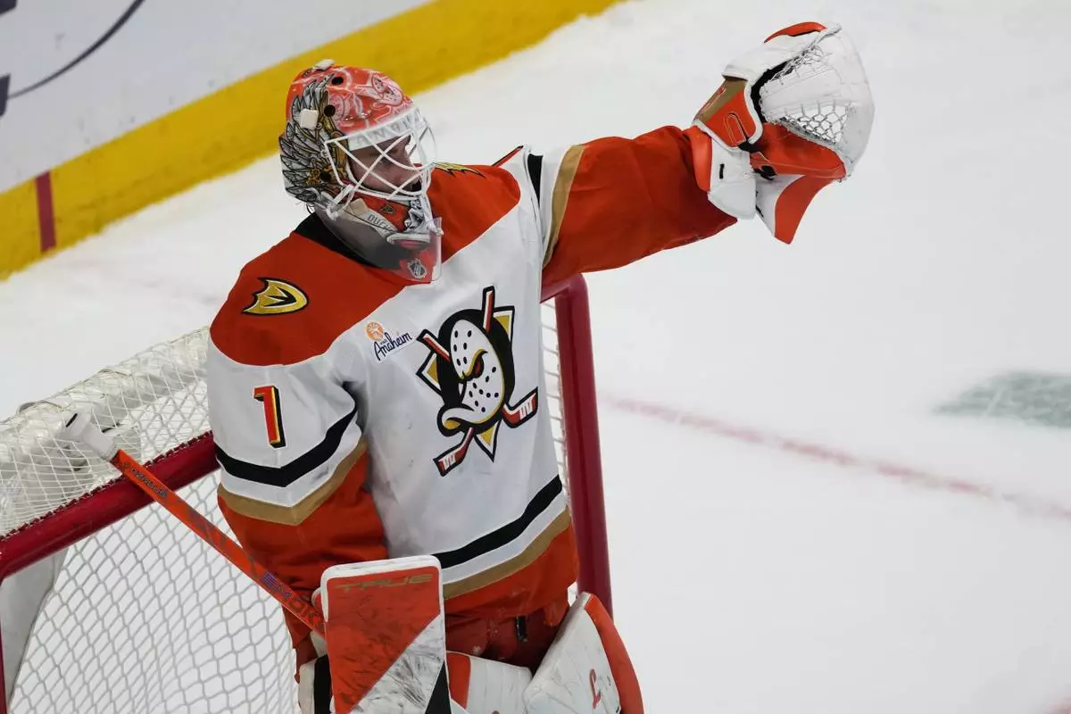 Anaheim Ducks goaltender Lukas Dostal celebrates after a shootout victory over the Colorado Avalanche in an NHL hockey game Wednesday, Jan. 21, 2026, in Denver. (AP Photo/David Zalubowski)