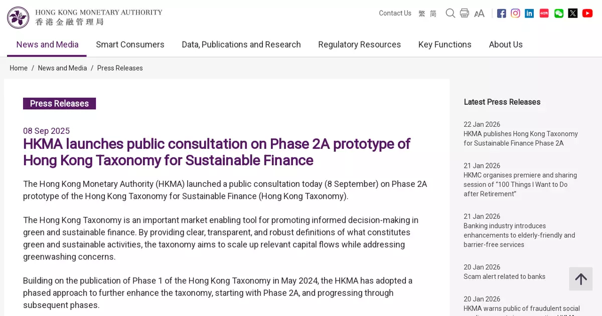 The Hong Kong Monetary Authority (HKMA) published today (January 22) the Hong Kong Taxonomy for Sustainable Finance (Hong Kong Taxonomy) Phase 2A, marking an important step in facilitating green and sustainable capital flows and supporting the region's transition to a lowcarbon economy.