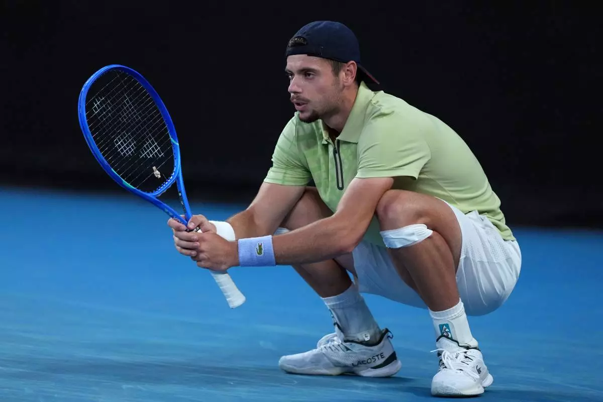 Arthur Gea of France reacts during his second round match against Stan Wawrinka of Switzerland at the Australian Open tennis championship in Melbourne, Australia, Thursday, Jan. 22, 2026. (AP Photo/Asanka Brendon Ratnayake)