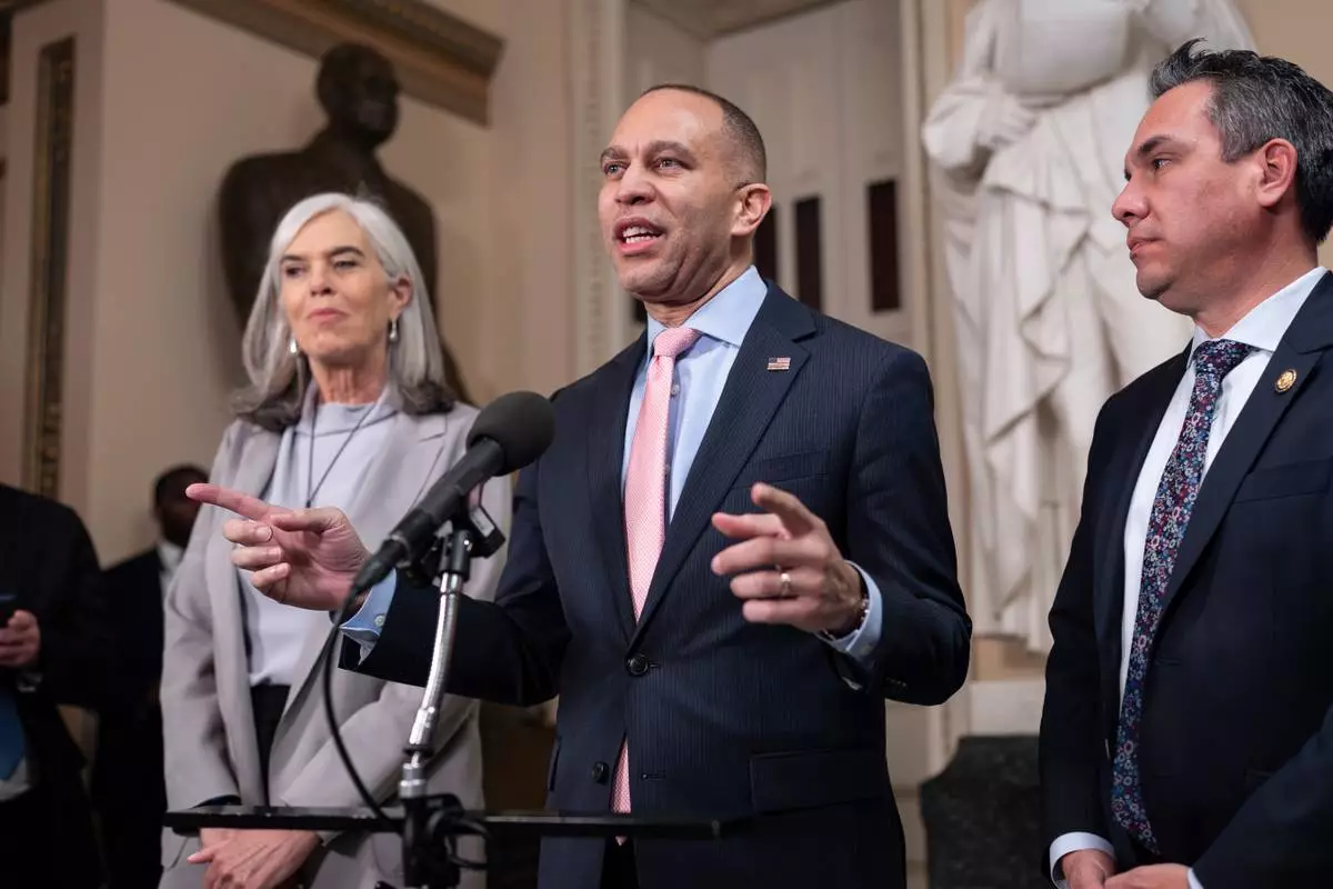House Minority Leader Hakeem Jeffries, D-N.Y., joined by Rep. Katherine Clark, D-Mass., left, and Rep. Pete Aguilar, D-Calif., speaks to reporters just after the House passed legislation that extends expired health care subsidies for those who get coverage through the Affordable Care Act, at the Capitol in Washington, Thursday, Jan. 8, 2026. (AP Photo/J. Scott Applewhite)