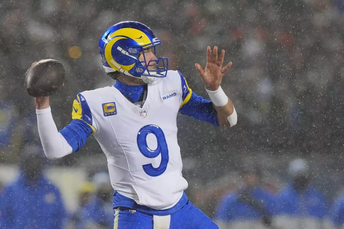 Los Angeles Rams quarterback Matthew Stafford throws a pass against the Chicago Bears during the first half of an NFL football divisional playoff game Sunday, Jan. 18, 2026, in Chicago. (AP Photo/Nam Y. Huh)