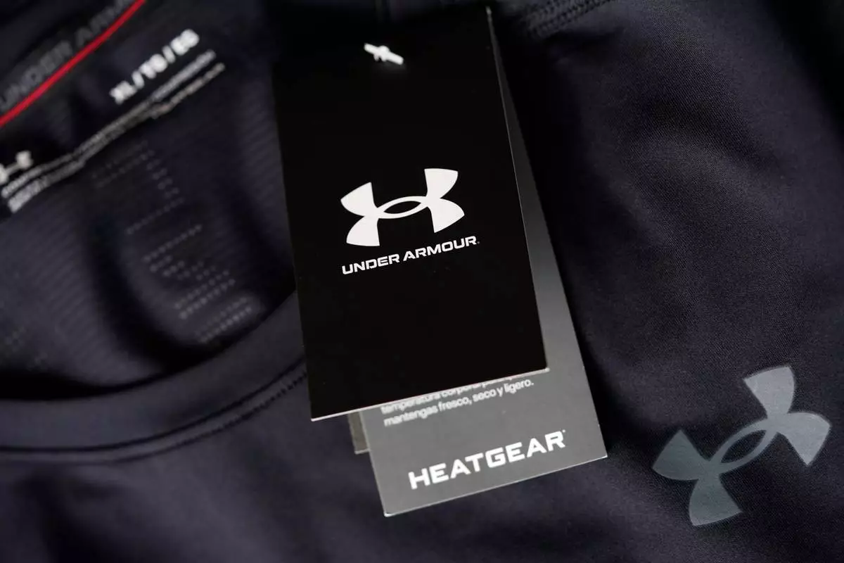 FILE - The company logo graces a sales tag on a compression shirt for sale in an Under Armour store in an outlet mall on May 3, 2021, in Lakewood, Colo. (AP Photo/David Zalubowski, File)