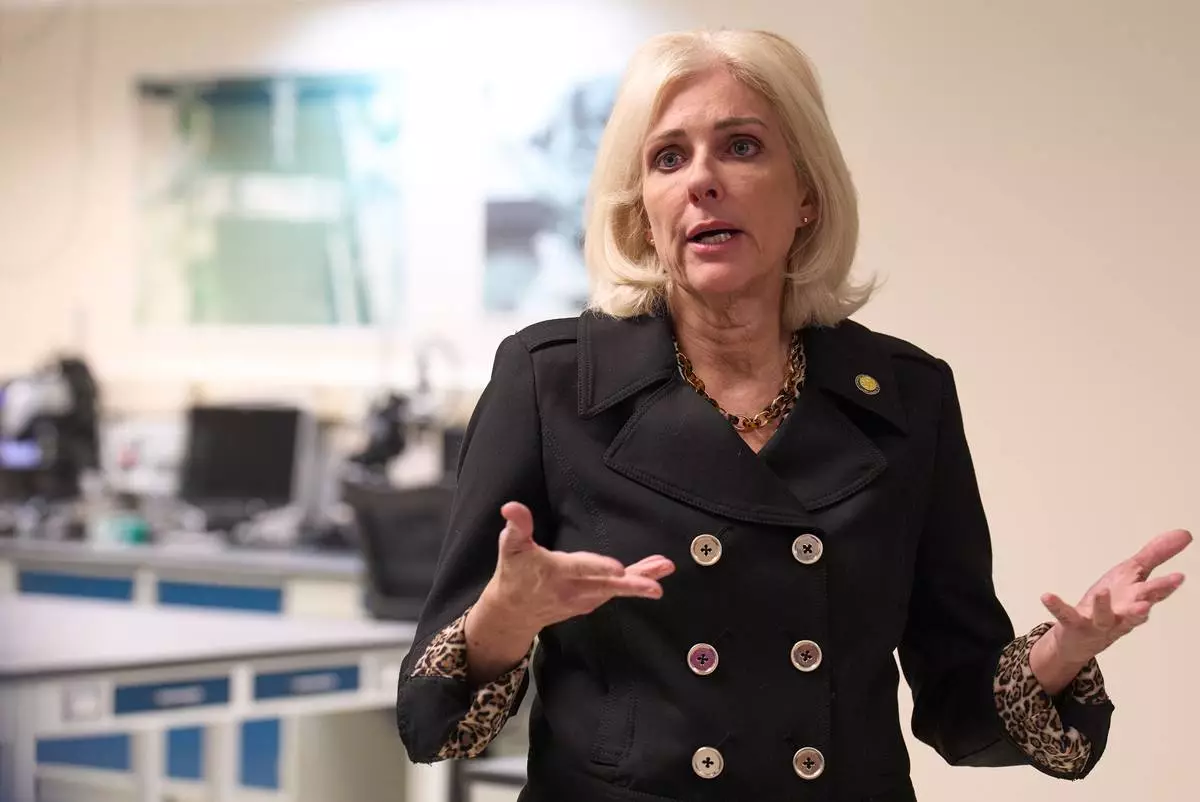 Jennifer Homendy, chair of the National Transportation Safety Board (NTSB), speaks with journalists during a tour of the NTSB's laboratories, Tuesday, Jan. 20, 2026, in Washington. (AP Photo/Jacquelyn Martin)