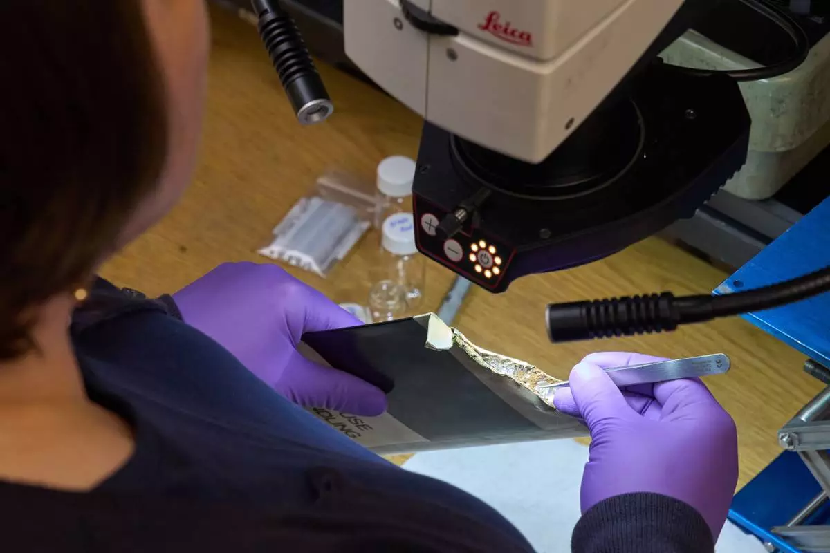 Materials Engineer Adrienne Lamm, uses an optical microscope to examine debris from inside the tail rotor blade of a helicopter, inside the Materials Laboratory of the National Transportation Safety Board (NTSB), Tuesday, Jan. 20, 2026, in Washington. (AP Photo/Jacquelyn Martin)