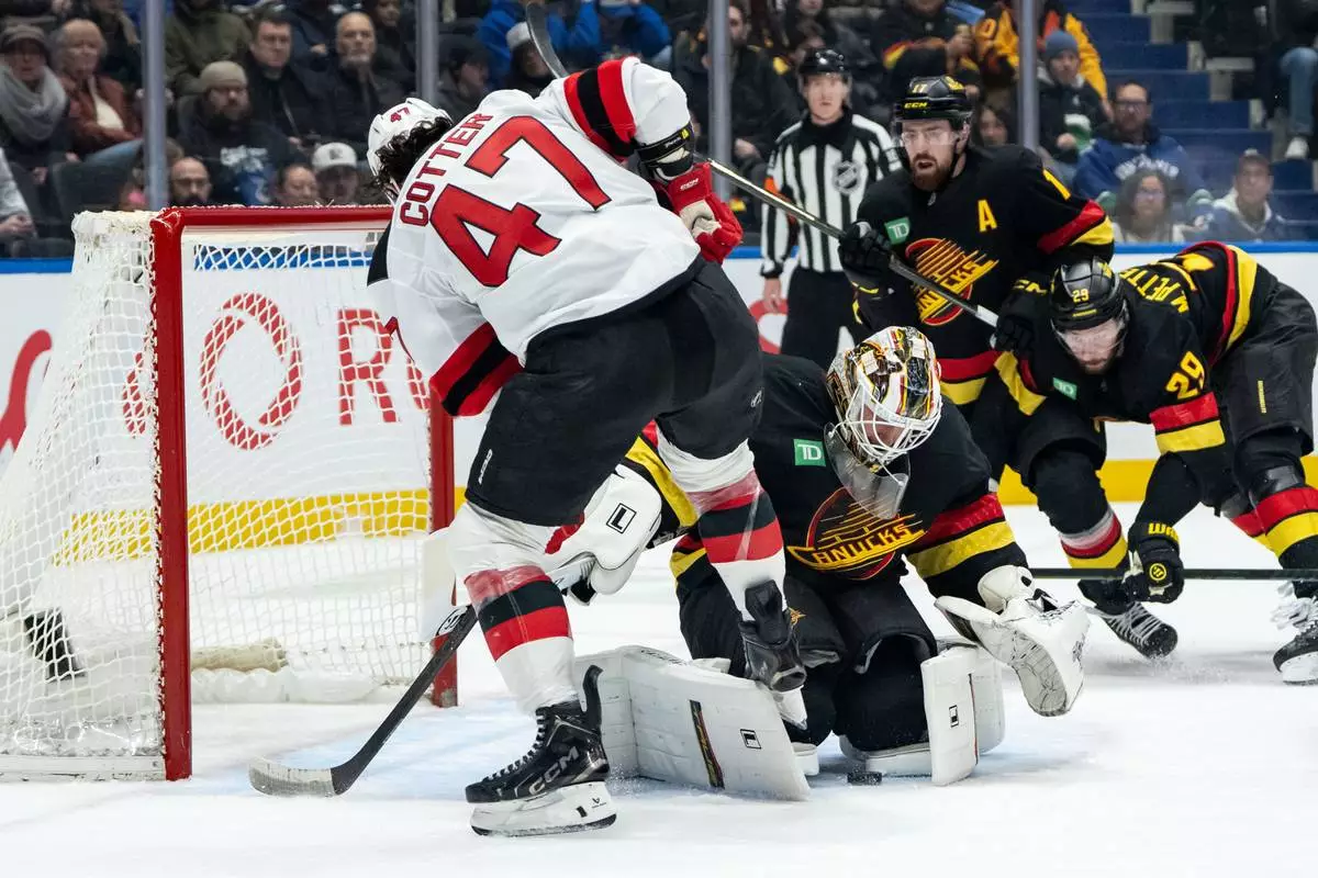 Vancouver Canucks goaltender Kevin Lankinen (32) stops New Jersey Devils' Paul Cotter (47) during the second period of an NHL hockey game in Vancouver, British Columbia, Friday, Jan. 23, 2026. (Ethan Cairns/The Canadian Press via AP)
