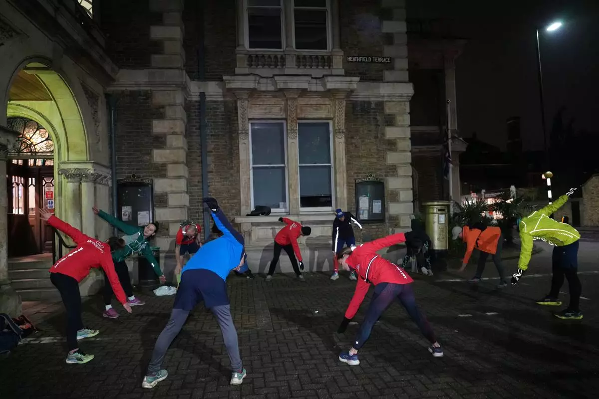 Participants in the Goodgym group warm up before running to collect litter to keep the River Thames free of plastic and other waste in London, Wednesday, Jan. 14, 2026. (AP Photo/Kirsty Wigglesworth)