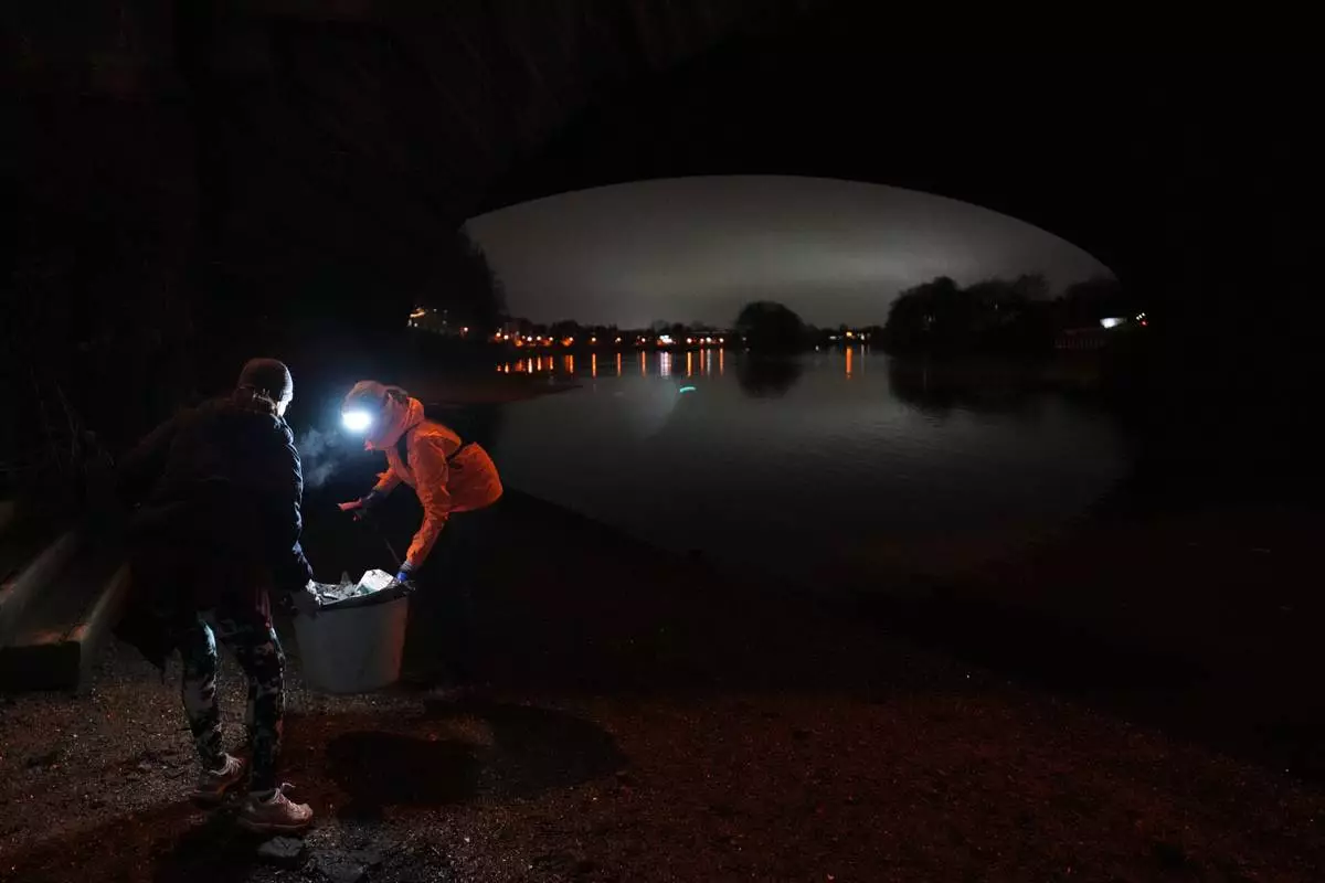 Participants in the Goodgym group collect litter from the riverbank to keep the River Thames free of plastic and other waste in London, Wednesday, Jan. 14, 2026. (AP Photo/Kirsty Wigglesworth)