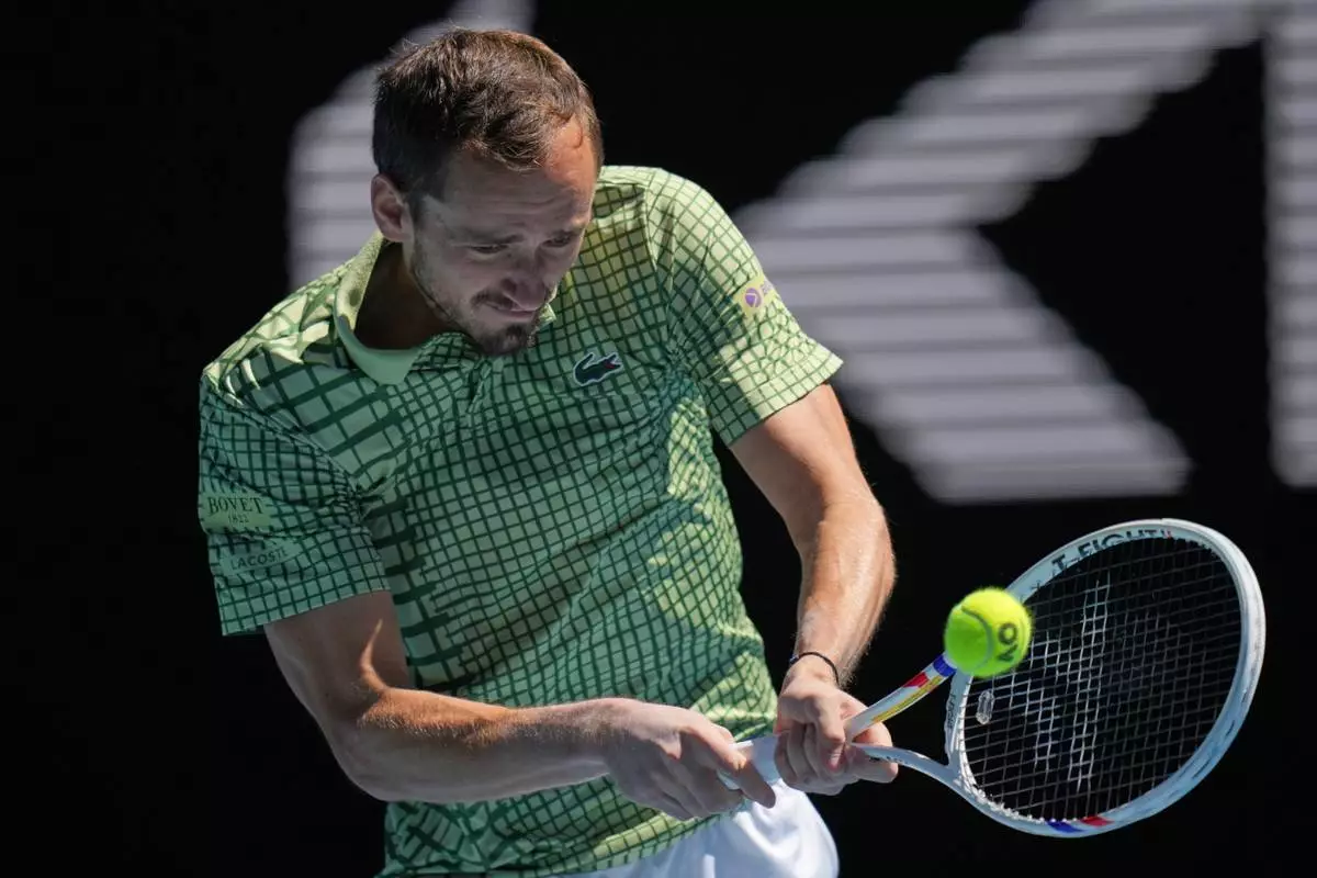 Daniil Medvedev of Russia plays a backhand return to Fabian Marozsan of Hungary during their third round match at the Australian Open tennis championship in Melbourne, Australia, Friday, Jan. 23, 2026. (AP Photo/Dita Alangkara)