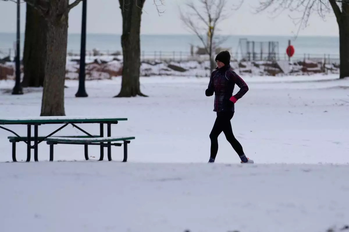 A person jogs on a snow-covered sidewalk during a cold weather day in Evanston, Ill., Thursday, Jan. 22, 2026. (AP Photo/Nam Y. Huh)