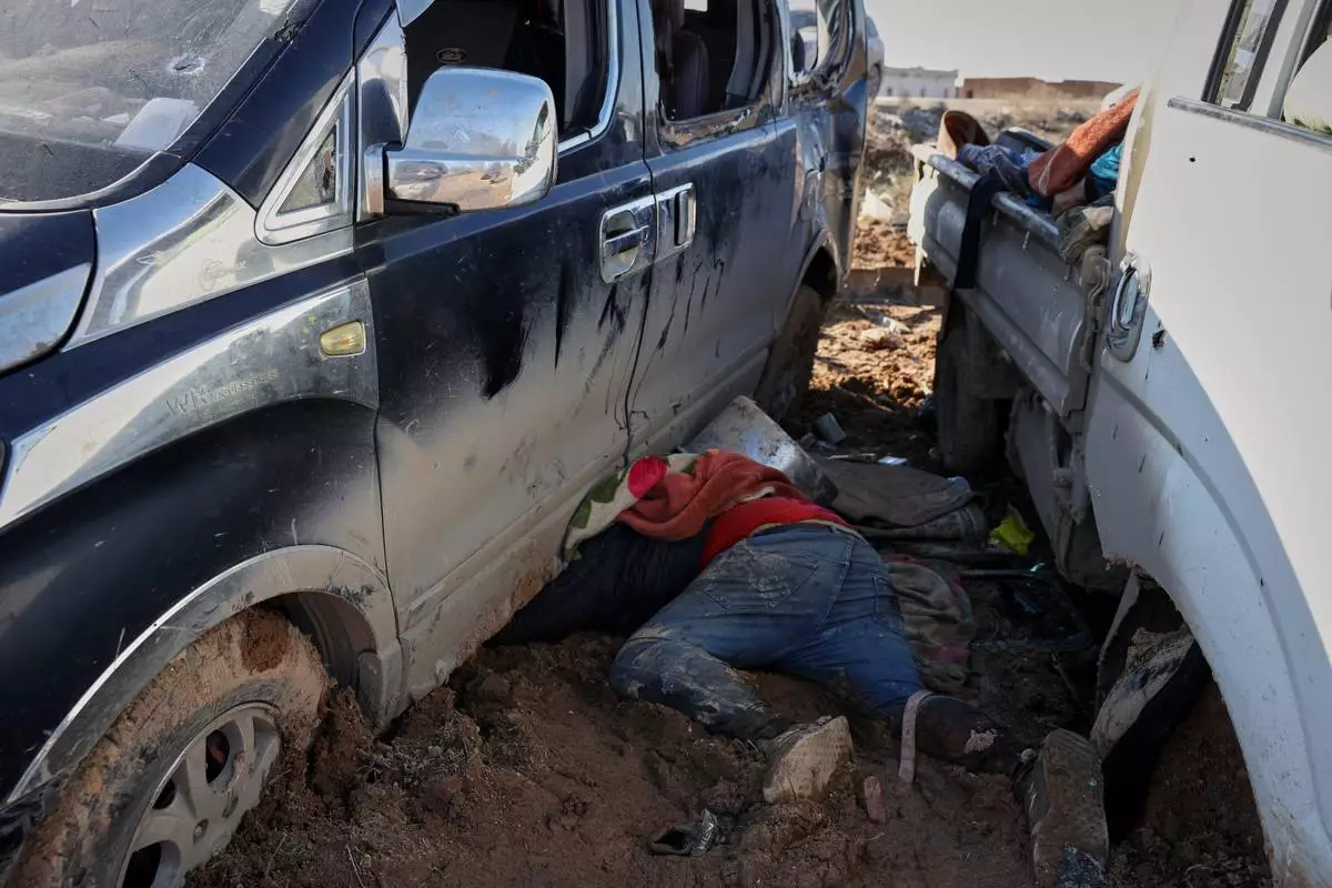 FILE - The bodies of retreating Syrian Democratic Forces fighters lie on the side of the road between government-controlled Raqqa and SDF-controlled Hassakeh, in northeastern Syria, Tuesday, Jan. 20, 2026. (AP Photo/Omar Albam, File)