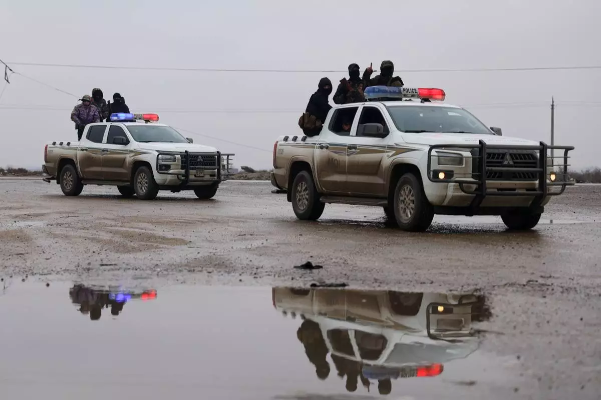Syrian government forces drive inside the al-Aqtan prison after taking control of it from the Kurdish-led Syrian Democratic Forces, SDF, in Raqqa, northeastern Syria, Friday, Jan. 23, 2026. (AP Photo/Ghaith Alsayed)