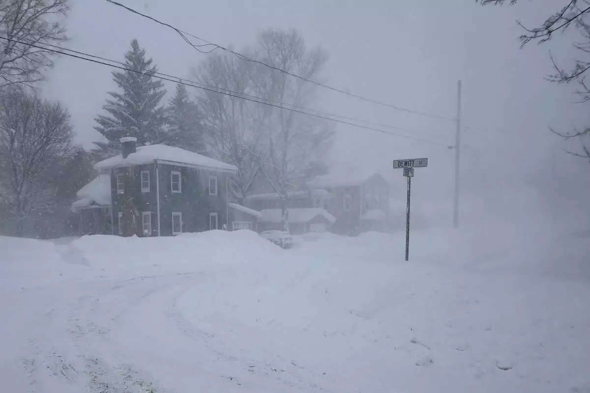 Strong winds kick up snow in Lowville, New York, on Friday, Jan. 23, 2026. (AP Photo/Cara Anna)