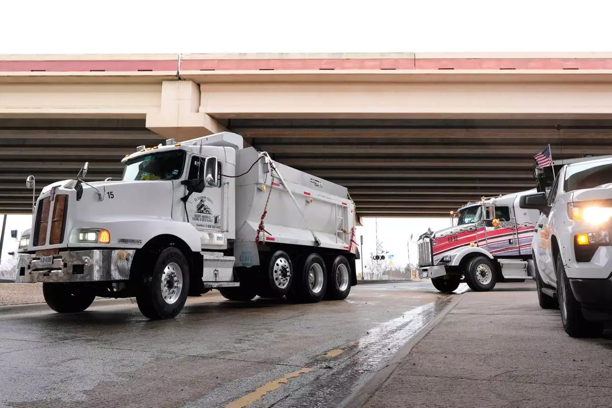 Work crews stage with de-icing materials in their trucks ahead of expected inclement weather in Plano, Texas, Friday, Jan. 23, 2026. (AP Photo/Tony Gutierrez)