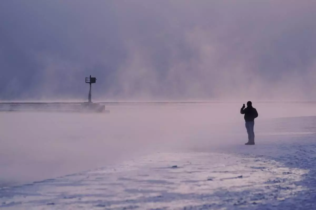 Doug Kunde watches as steam is seen over Lake Michigan as frigid temperatures for the day are not expected to reach zero degrees Friday, Jan. 23, 2026, in Milwaukee. (AP Photo/Morry Gash)