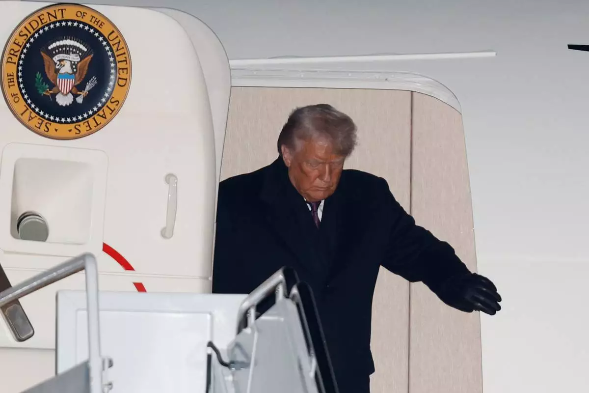 President Donald Trump arrives on Air Force Oneat Joint Base Andrews, Md., Thursday, Jan. 22, 2026, after returning from the World Economic Forum in Davos. (AP Photo/Luis M. Alvarez)