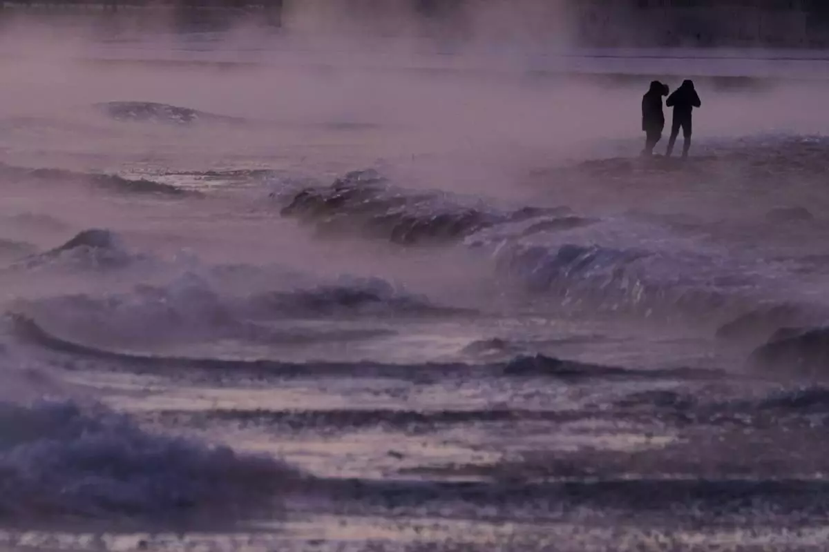 People walk on an ice covered beach along the shore of Lake Michigan, Friday, Jan. 23, 2026, in Chicago. (AP Photo/Kiichiro Sato)