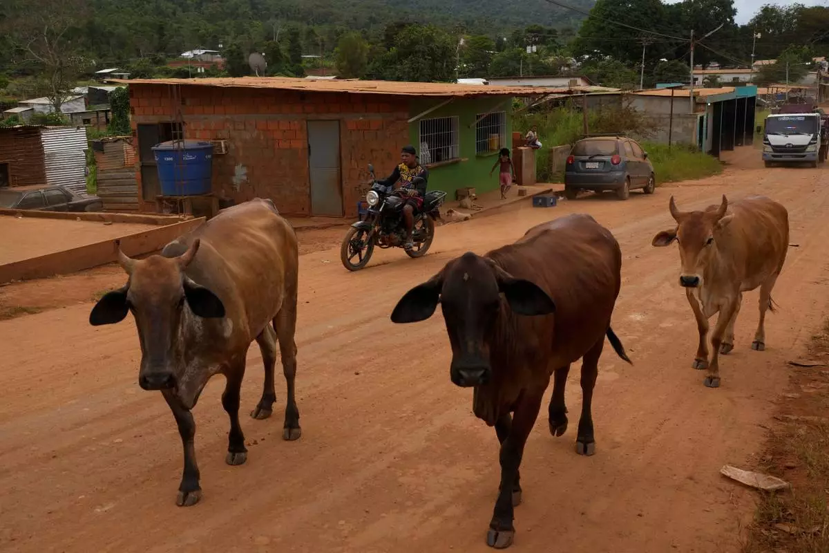 Cows are herded through the gold mining town of El Callao, Venezuela, Tuesday, Jan. 22, 2026. (AP Photo/Matias Delacroix)
