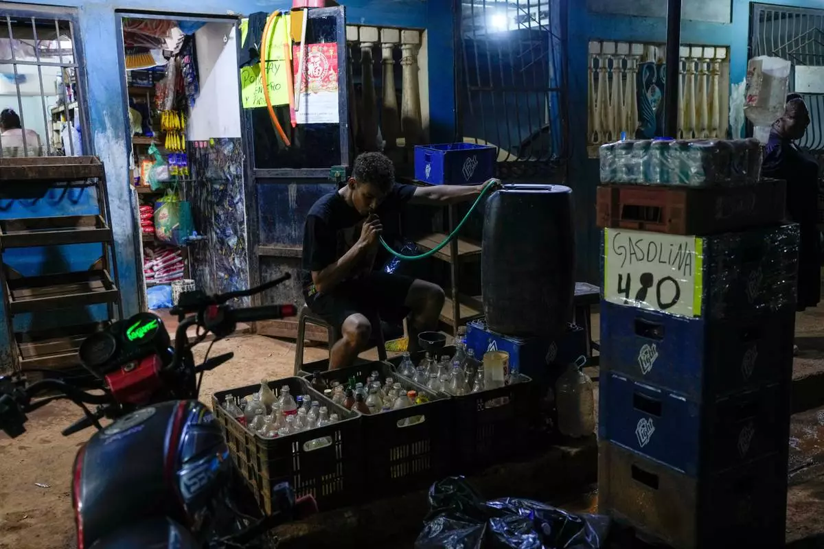 A man sucks on a water hose to fill bottles with gasoline to sell in the gold mining region of El Callao, Venezuela, Tuesday, Jan. 22, 2026. (AP Photo/Matias Delacroix)