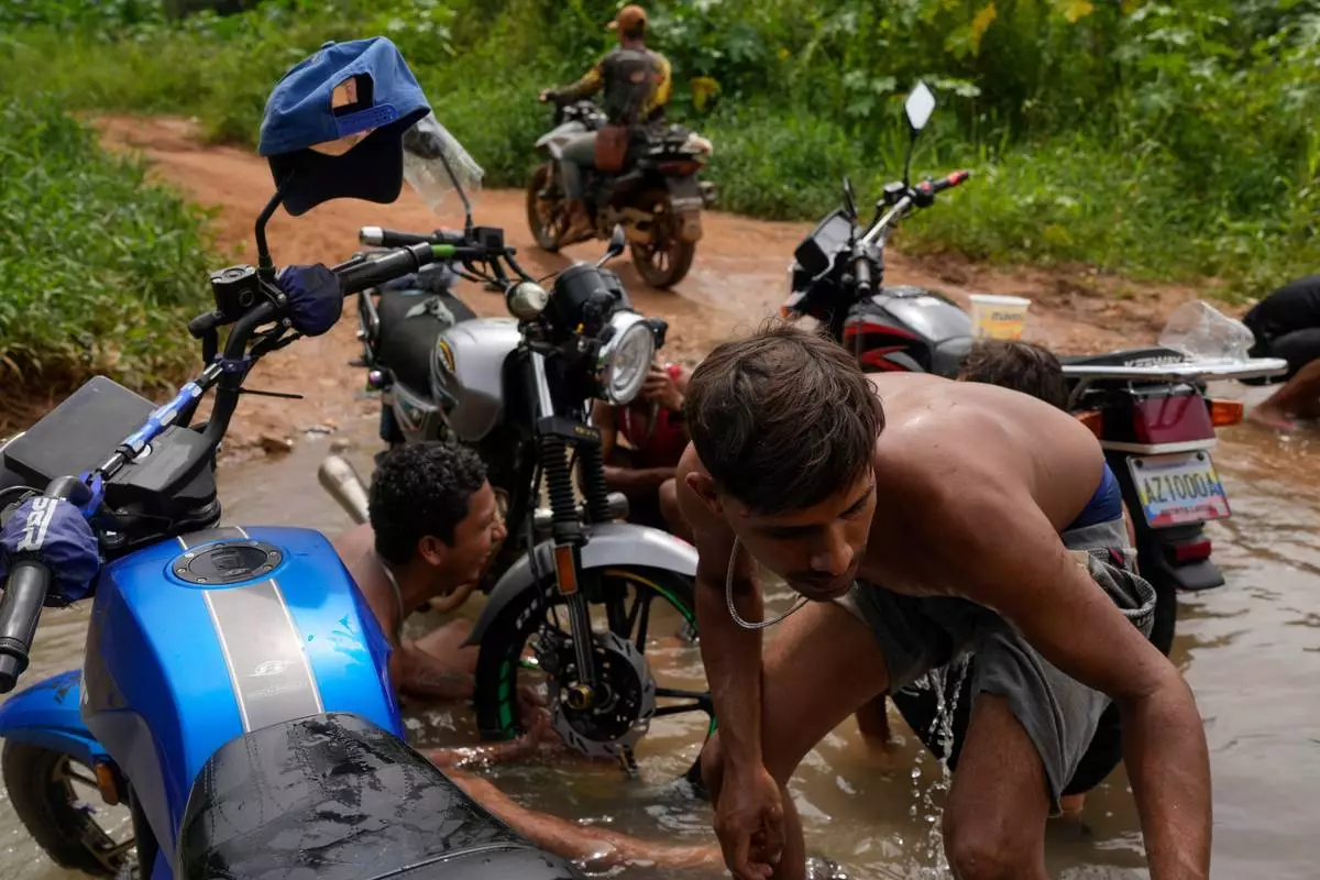 Gold miners wash their motorbike in a creek in El Callao, Venezuela, Tuesday, Jan. 22, 2026. (AP Photo/Matias Delacroix)