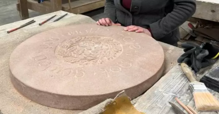 Jennie Regan stands beside the stone she carved with an inscription from a Scottish fairy tale at Dumfries House in Cumnock, Scotland, Nov. 26, 2025. (AP Photo/Danica Kirka)