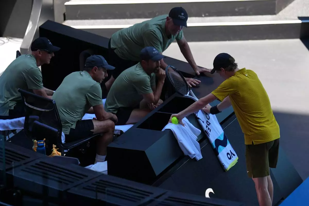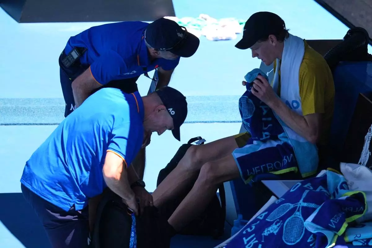 MELBOURNE, Australia (AP) — Limping and desperately trying to stretch out cramps in his arms and legs, Jannik Sinner had just gone down a break in the third set when the extreme heat rules saved him.
