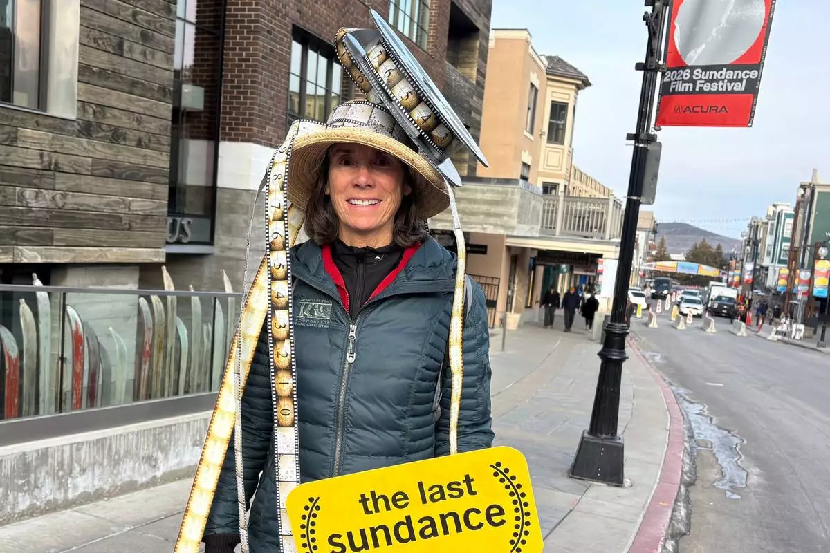 A woman wearing a film reel on her head holds a sign that reads "the last sundance" while attending final Sundance Film Festival in Park City, Utah, on Friday, Jan. 23, 2026, before the festival moves next year to Boulder, Colo. (AP Photo/Hannah Schoenbaum)