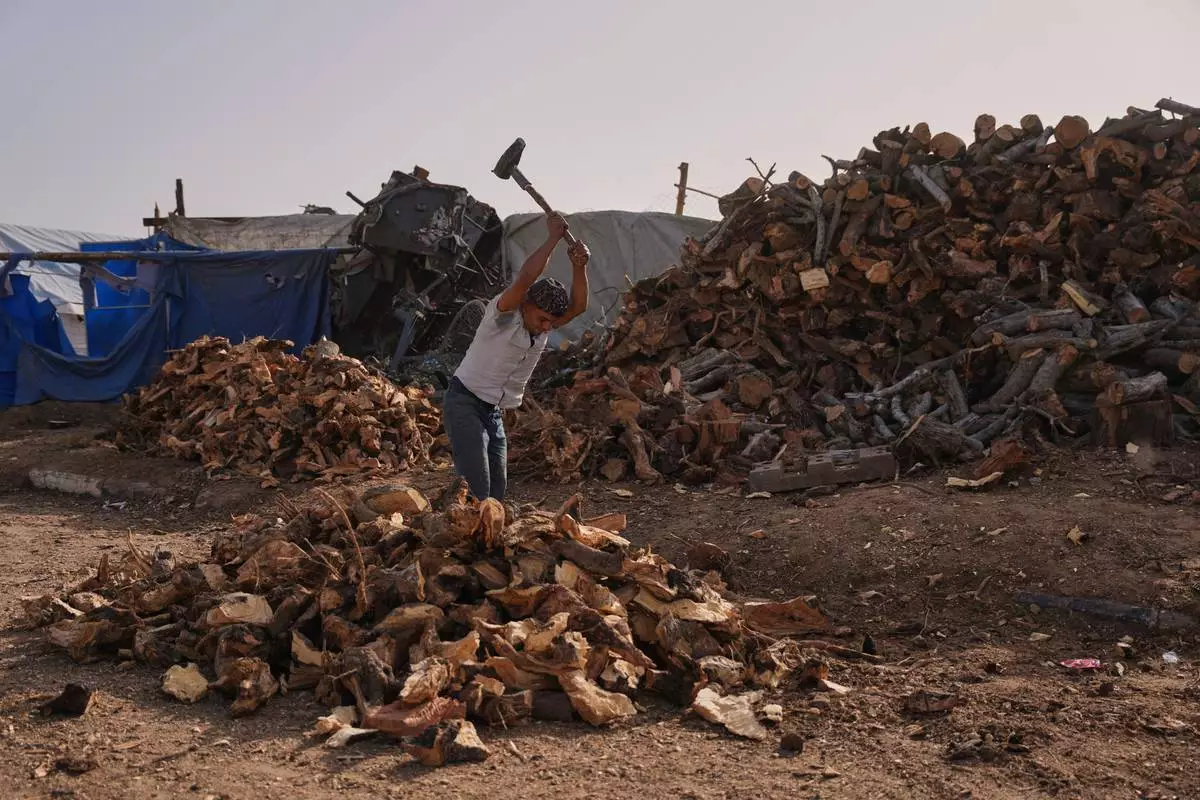 Palestinian Mohanad Eslem, 22, cuts firewood for sale in front of his shop on Salah al-Din Street near al-Bureij camp, central Gaza Strip, Saturday, Jan. 24, 2026. (AP Photo/Abdel Kareem Hana)