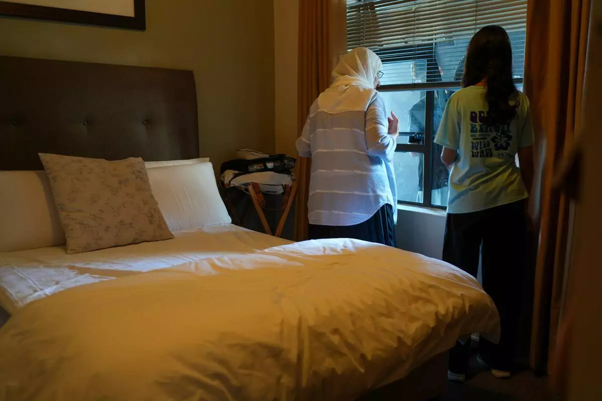 Palestinians who traveled to South Africa via a charter flight organized by an Israeli group whose founder supported U.S. President Donald Trump's proposal to resettle Palestinians from Gaza stand in their temporary flat in Johannesburg, South Africa, Wednesday, Feb. 4, 2026. (AP Photo/Jerome Delay)