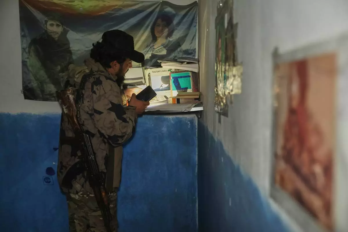 A Syrian security force member looks through documents inside a tunnel used by retreating Syrian Democratic Forces (SDF) fighters beneath Ain Issa, northeastern Syria, Saturday, Jan. 24, 2026. (AP Photo/Ghaith Alsayed)