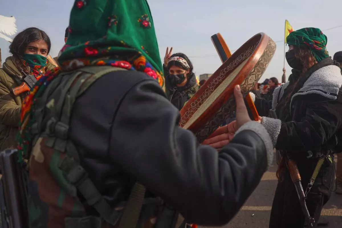 Kurdish fighters with the Syrian Democratic Forces (SDF) dance as they are cheered by local residents ahead of the end of a four-day truce with the Syrian government in Hassakeh, northeastern Syria, Saturday, Jan. 24, 2026. (AP Photo/Baderkhan Ahmad)