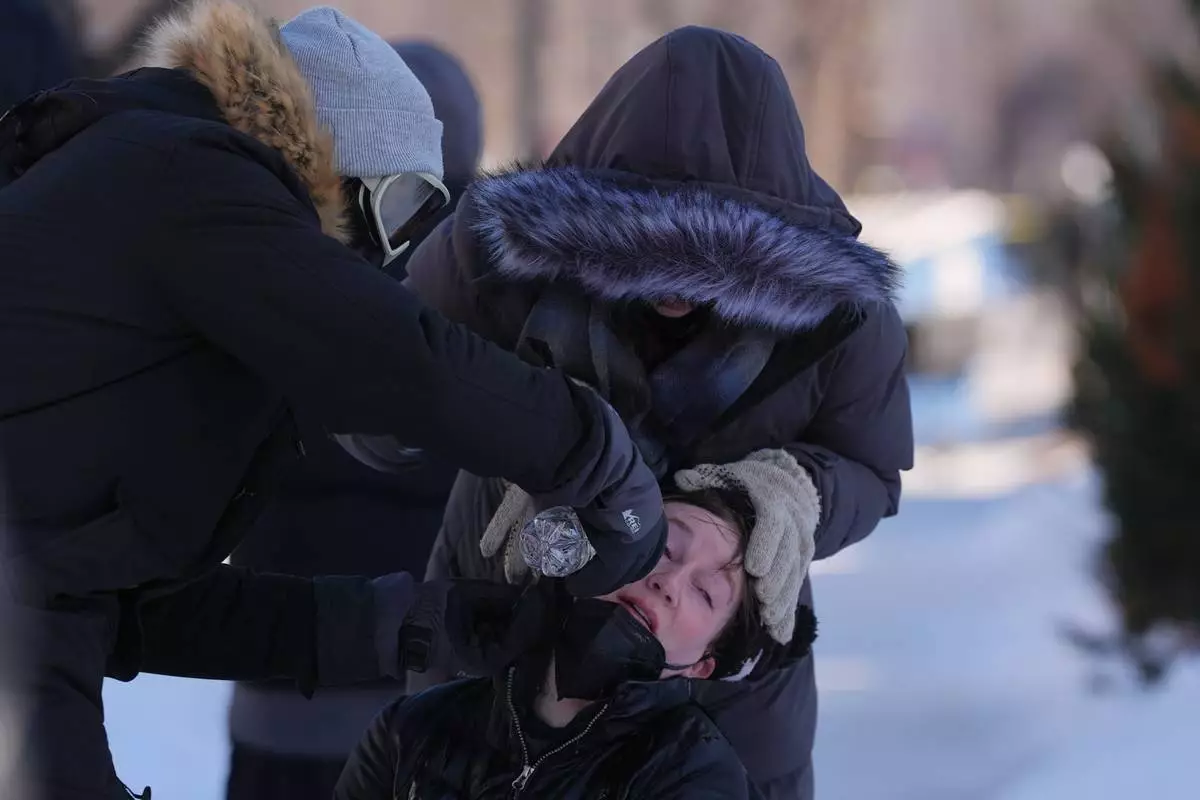 A person is tended to after federal immigration officers deploy tear gas Saturday, Jan. 24, 2026, in Minneapolis. (AP Photo/Abbie Parr)