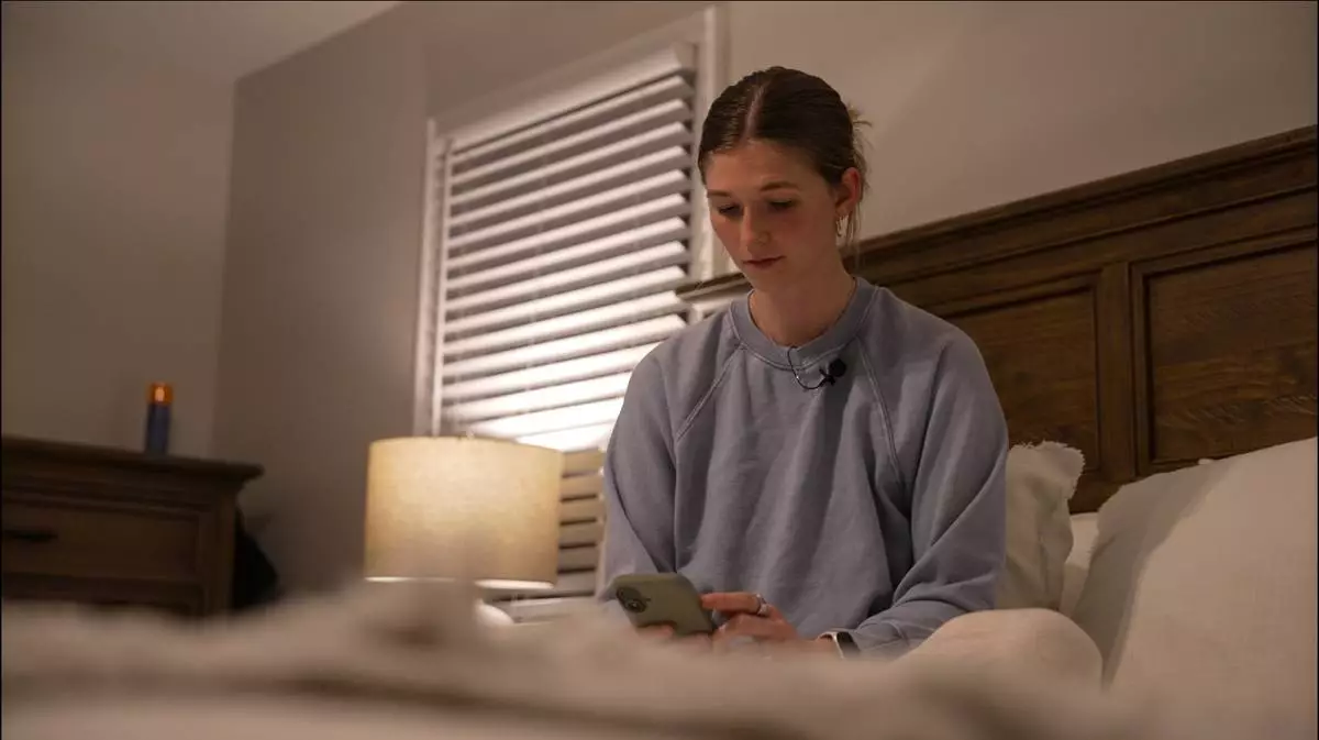 Middle school teacher Kate Stoye checks her sleep score on her phone, Wednesday, Jan. 7, 2026, in Hiram, Ga. (AP Photo/Emilie Megnien)