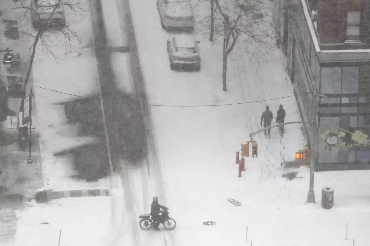 Pedestrians walk and ride their bike as heavy snow falls, Sunday, Jan. 25, 2026, in New York. (AP Photo/Heather Khalifa)