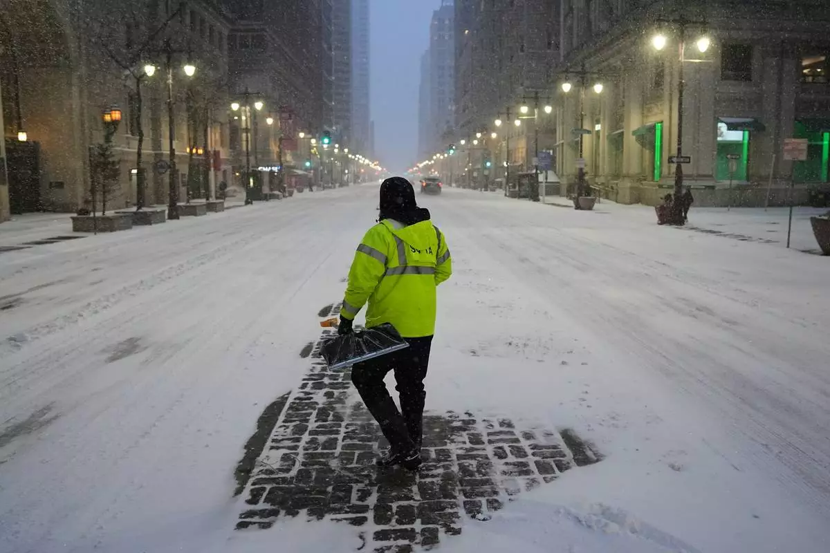 A worker shovels snow during a winter storm in Philadelphia, Sunday, Jan. 25, 2026. (AP Photo/Matt Rourke)