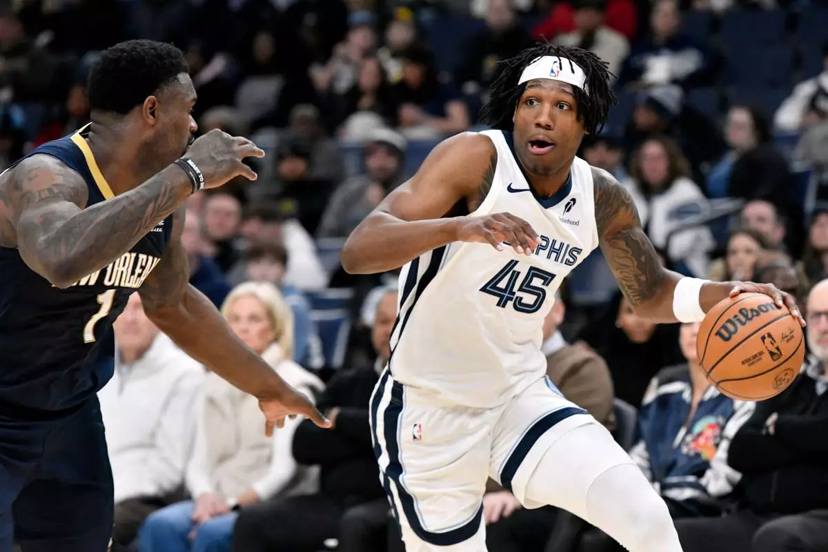 Memphis Grizzlies forward GG Jackson II (45) handles the ball against New Orleans Pelicans forward Zion Williamson (1) in the first half of an NBA basketball game Friday, Jan. 23, 2026, in Memphis, Tenn. (AP Photo/Brandon Dill)