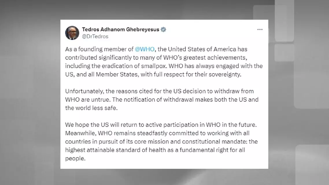 Commending the contribution made by the United States as a founding member to many of WHO's greatest achievements, Tedros wrote in the X post, "Unfortunately, the reasons cited for the U.S. decision to withdraw from WHO are untrue."