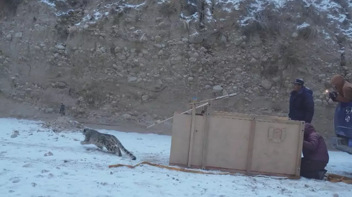 The adult snow leopard was previously captured after wandering into a herder's sheep pen in Wensu County.
