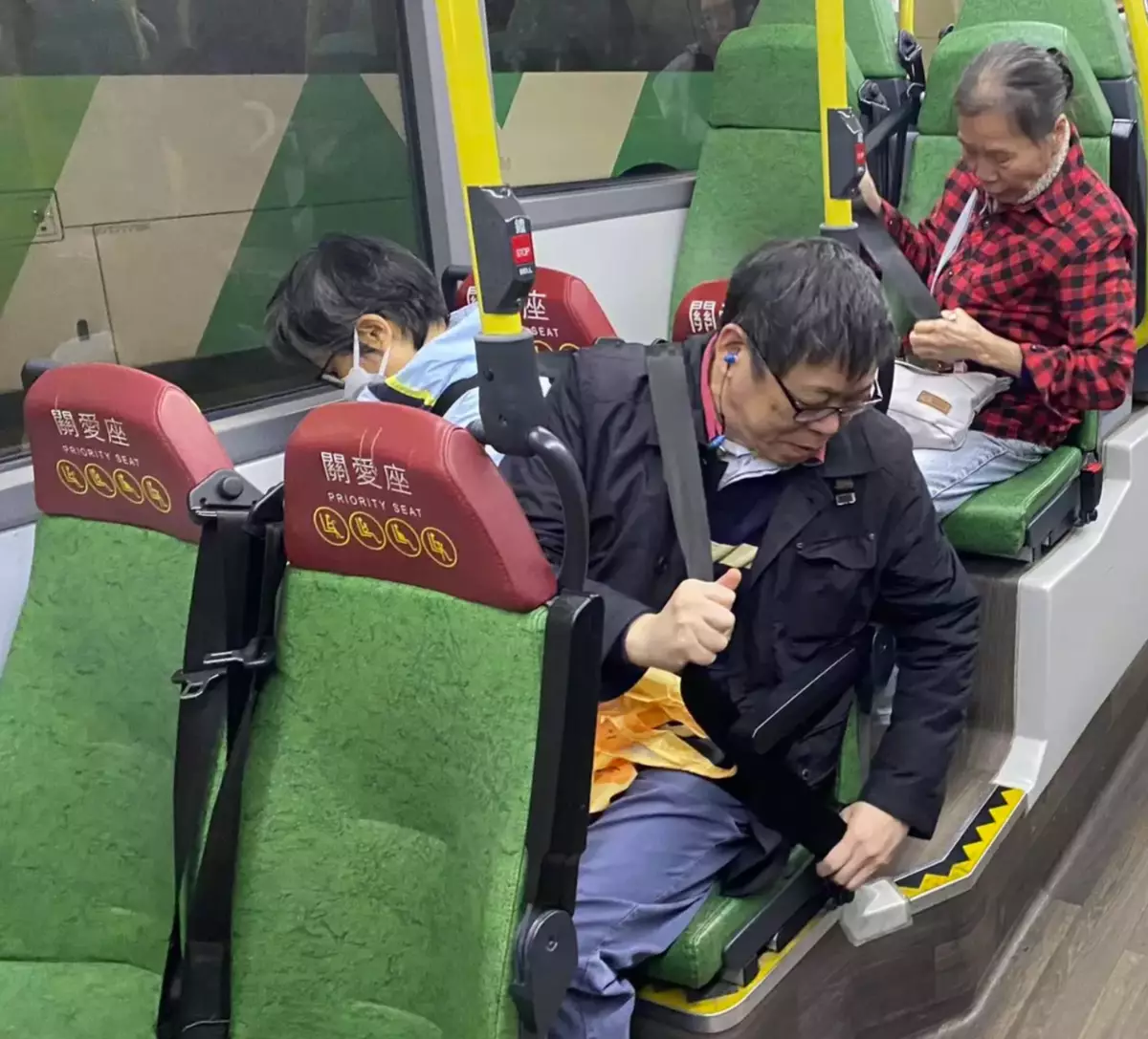 On a bus traveling from Olympic Station to Shek Lei, some seats were equipped with seat belts. One passenger said he was accustomed to wearing seat belts on public transport and would specifically choose seats with them, adding that wearing seat belts could ensure safety, and he didn't mind the inconvenience it would bring.