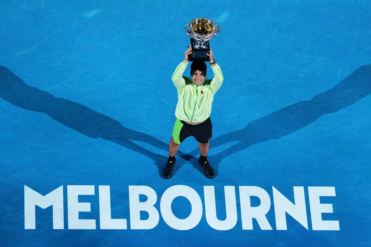 Carlos Alcaraz of Spain holds the Norman Brookes Challenge Cup after defeating Novak Djokovic of Serbia in the men's singles final match at the Australian Open tennis championship in Melbourne, Australia, Sunday, Feb. 1, 2026. (AP Photo/Dar Yasin)