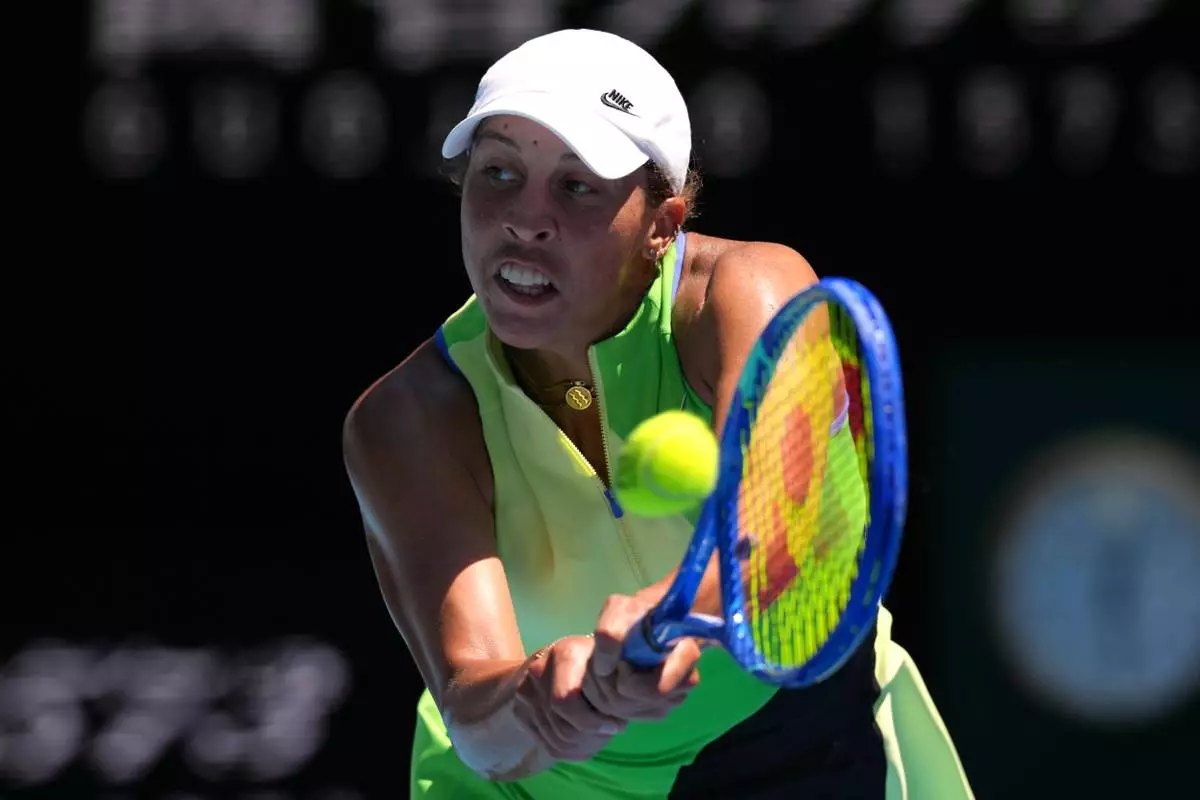 Madison Keys of the U.S. plays a backhand return to her compatriot Jessica Pegula during their fourth round match at the Australian Open tennis championship in Melbourne, Australia, Monday, Jan. 26, 2026. (AP Photo/Mark Baker)