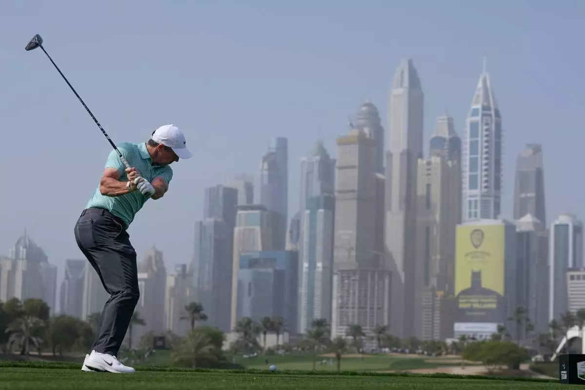 Rory McIlroy of Northern Ireland tees off at 8th hole during the final round of the Dubai Desert Classic in United Arab Emirates, Sunday, Jan. 25, 2026. (AP Photo/Altaf Qadri)